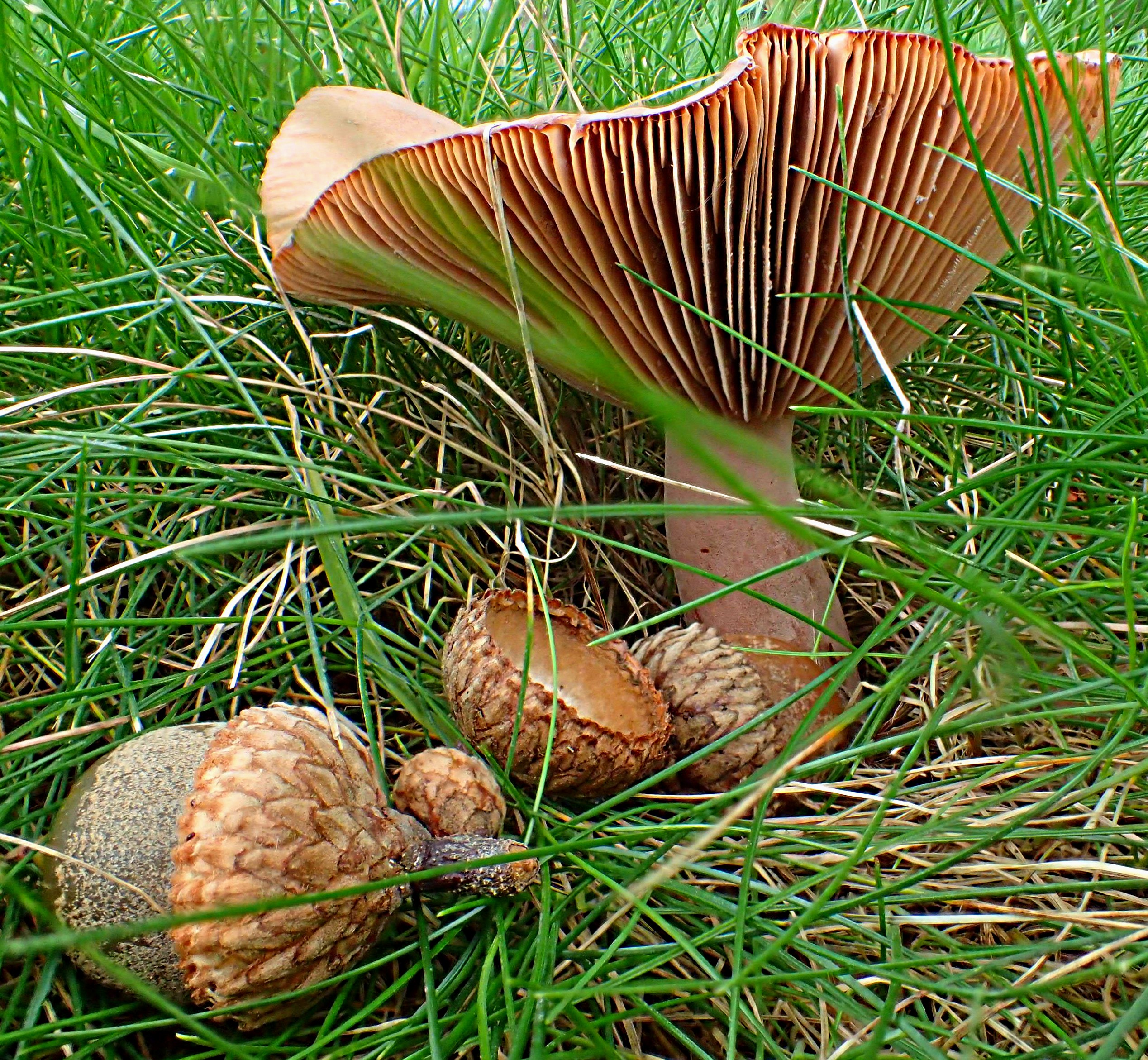 [These acorns from an old oak Tree accompany a lone mushroom.  If the acorns don’t grow into trees, they will decompose and will provide the mushroom with plenty of energy. Both the oak tree and the mushroom are sowing seeds for the future.]